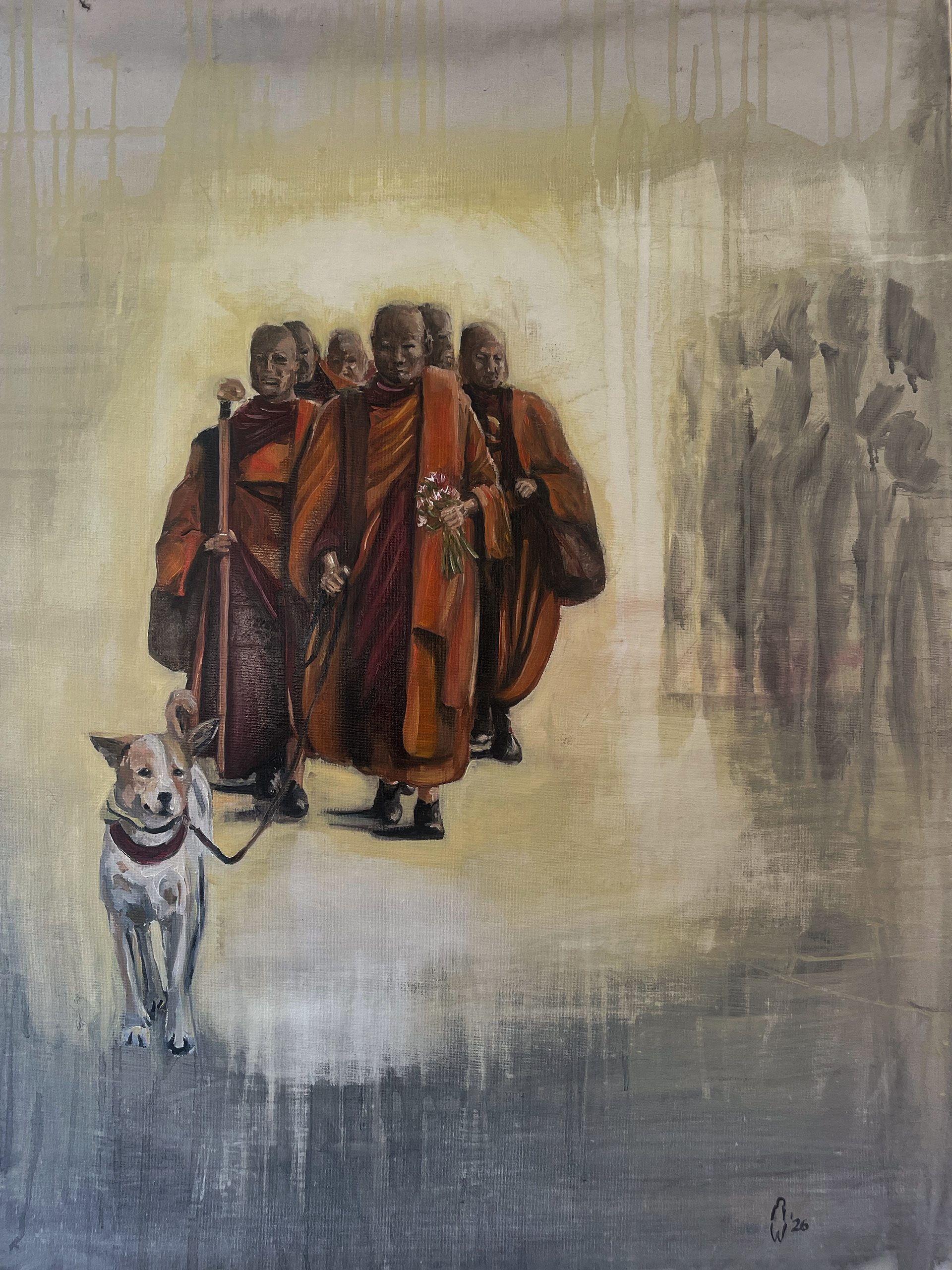 The origin of this painting lies in a photograph of this group of monks. One glance was enough — the image stayed with me.